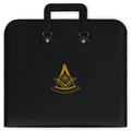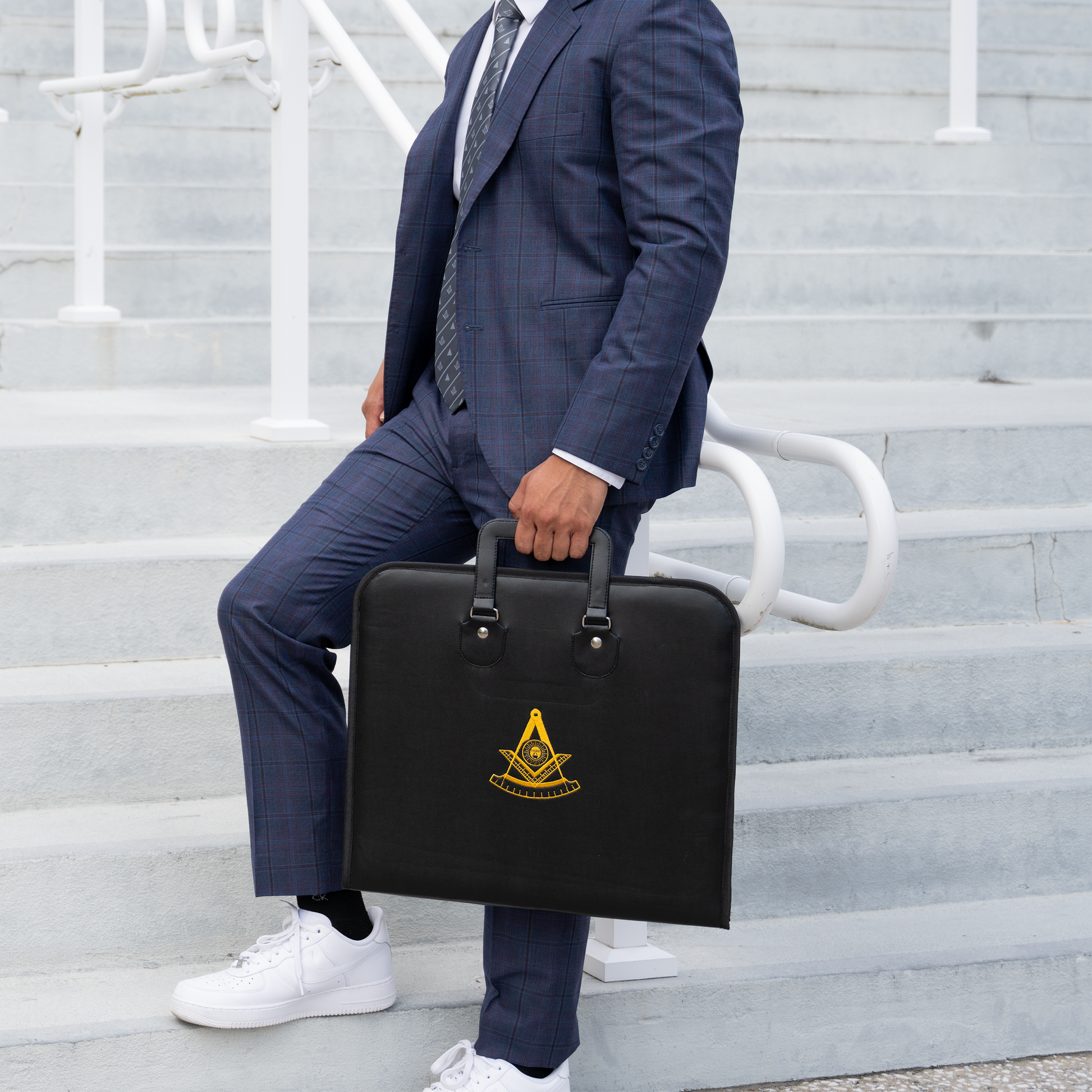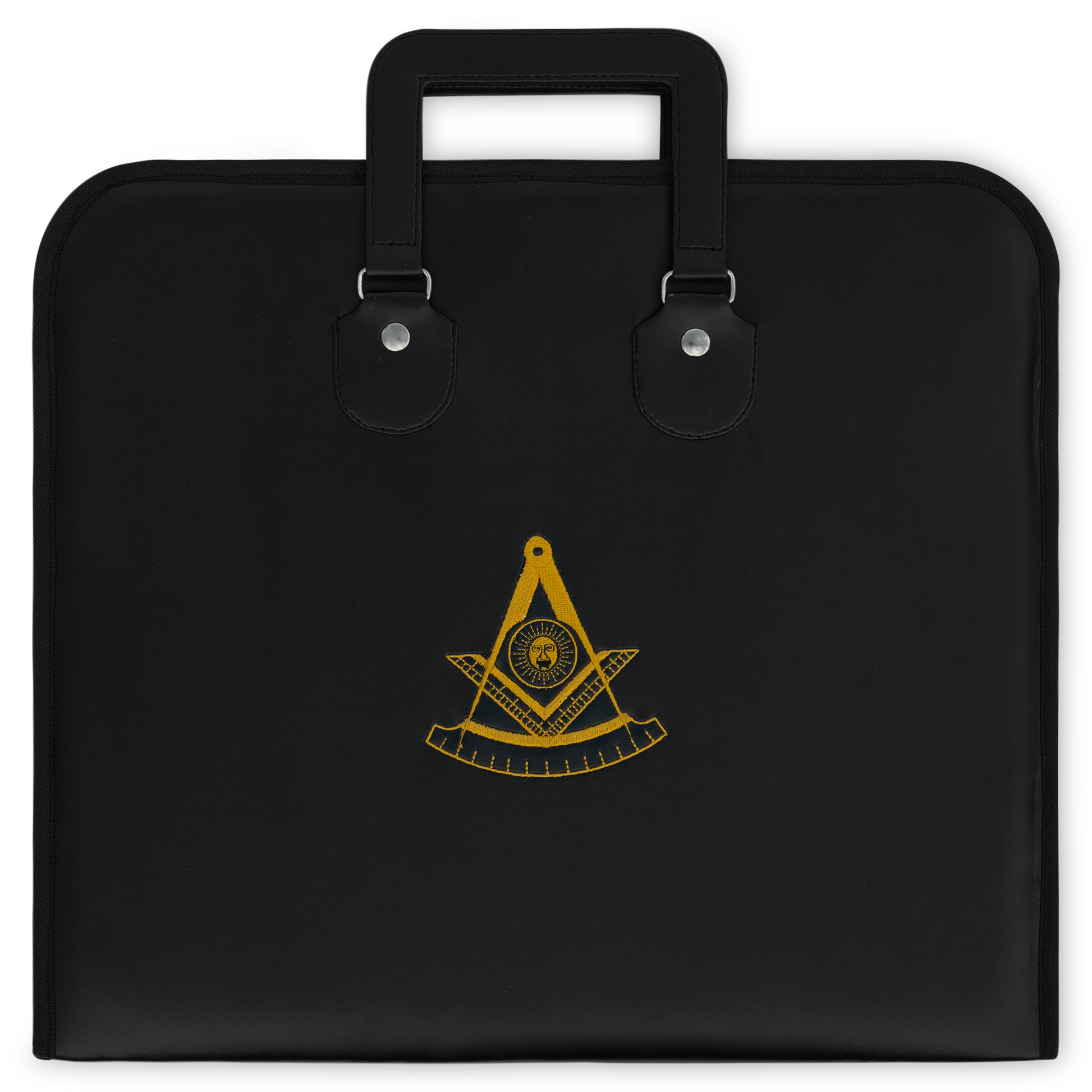 Black faux-leather apron case – Features a plush velvet interior and a machine-embroidered Square & Compass emblem; practical outside, refined inside.