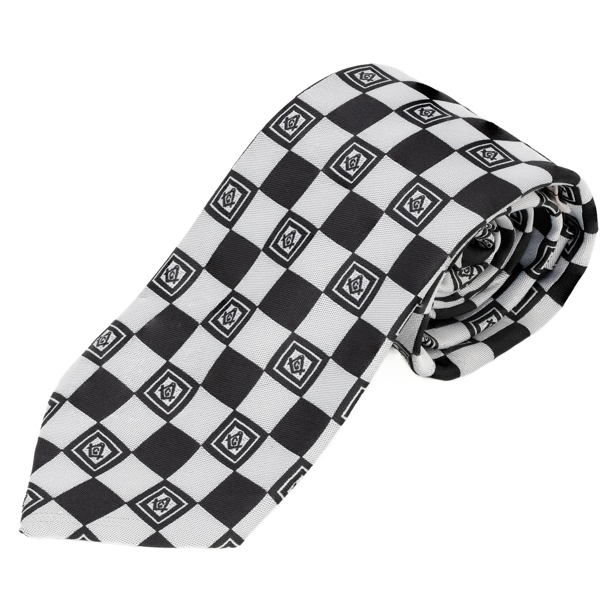 Black & White Masonic Tie – Geometric Square Pattern with Square & Compass Design