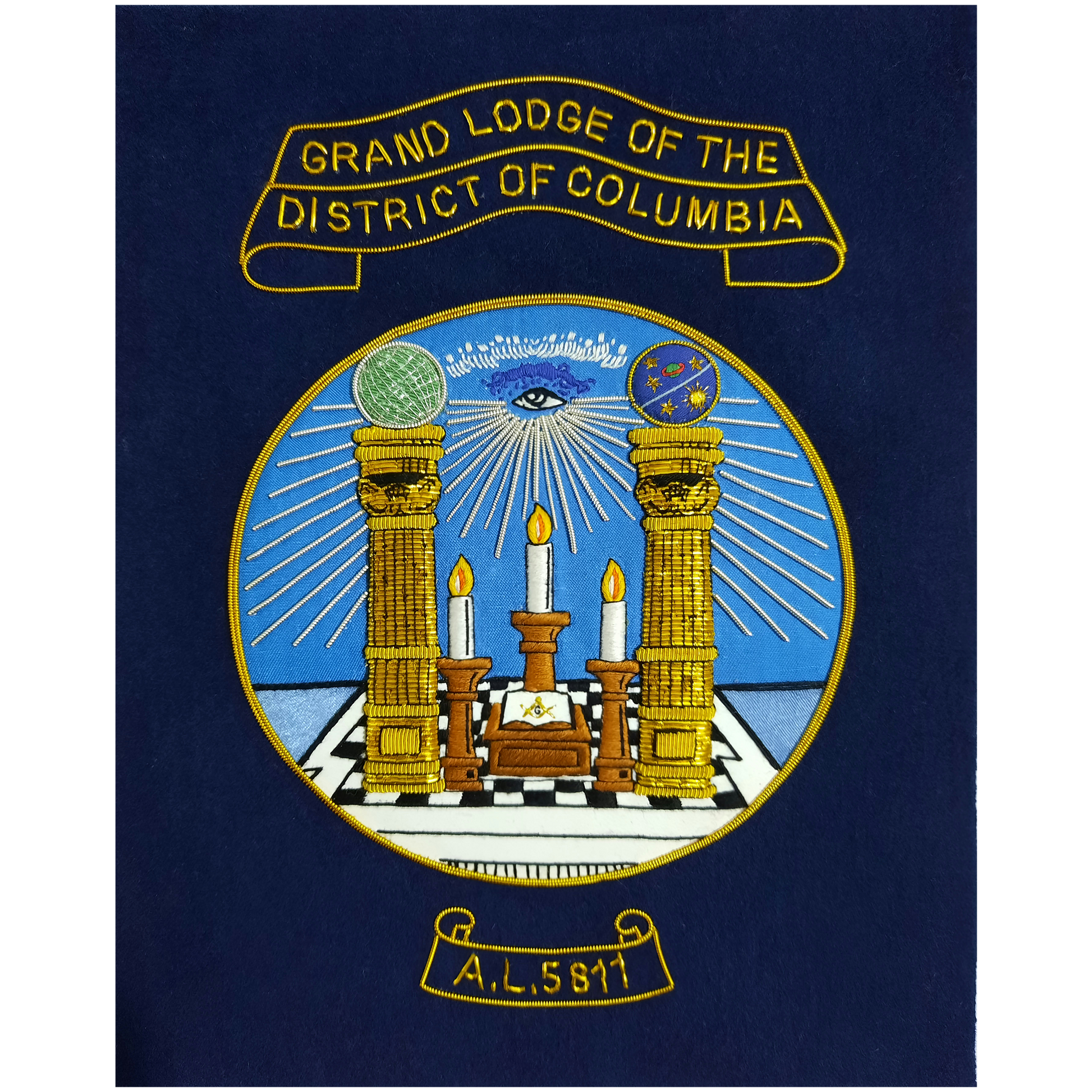 This Grand Lodge of Washington DC gift frame is hand embroidered on Navy blue wool fabric. The Alter and candles, and Mosaic checkered pavement are made with elegant thread embroidery on Faux leather. The columns, rays from all-seeing-eye, and letters in scrolls are embroidered in gold bullion.