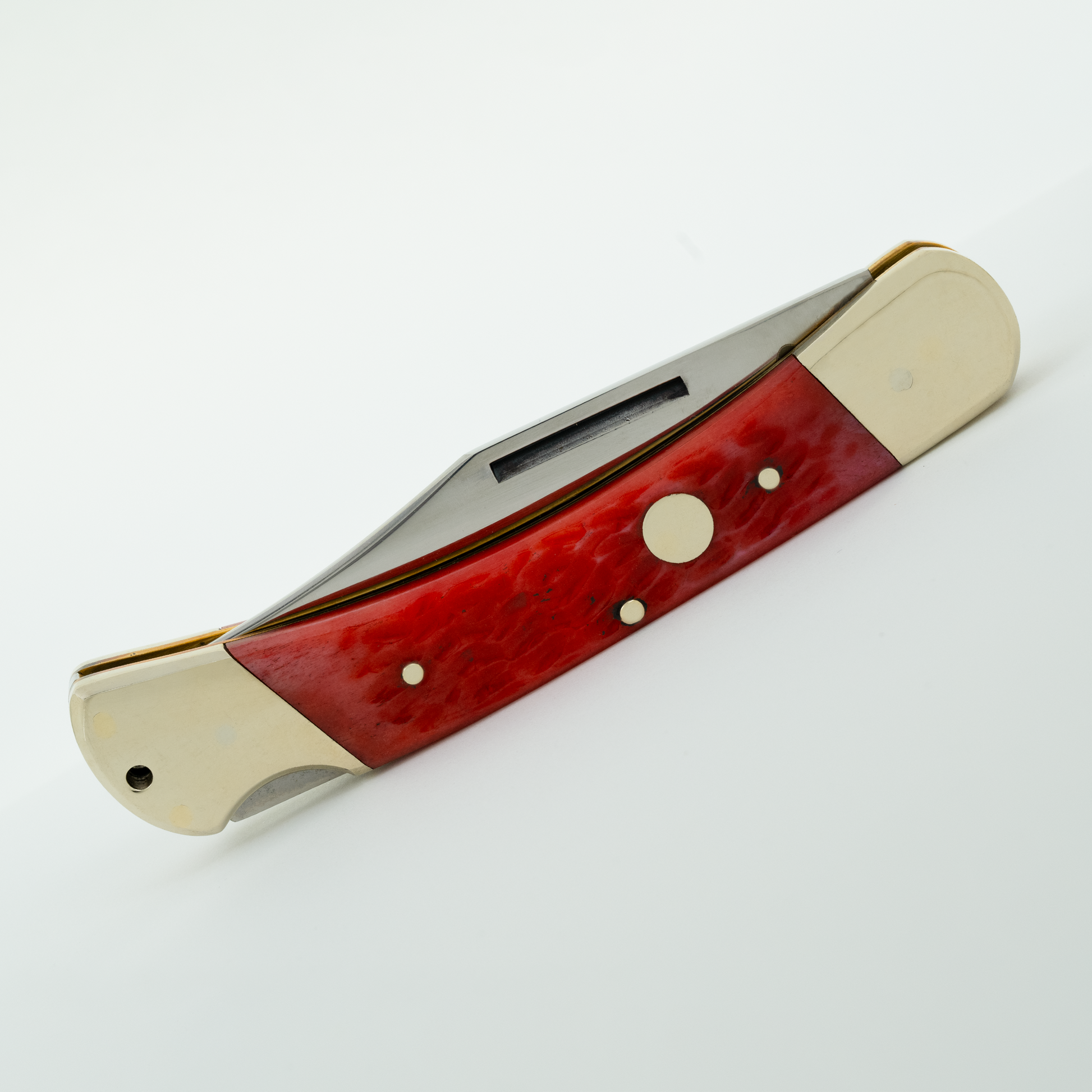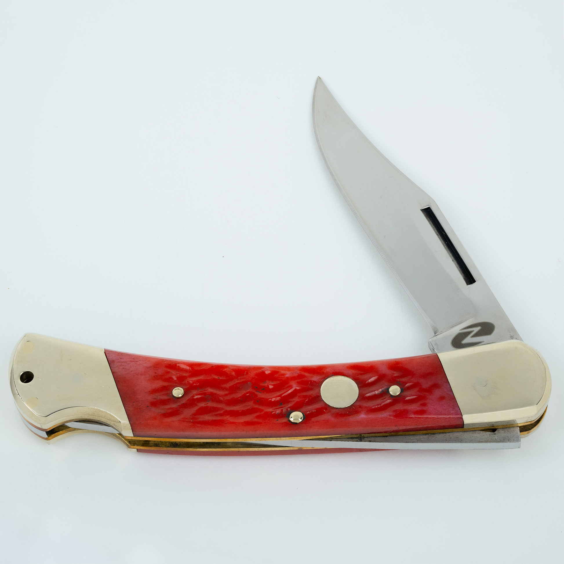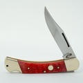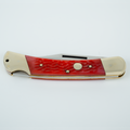 Genuine Jigged Bone Handle (Red): The genuine jigged bone handle of this Tiny Traveler knife features a striking red hue, combining both aesthetic appeal and functionality. The jigging process creates a textured surface, enhancing grip and providing a tactile experience during use.