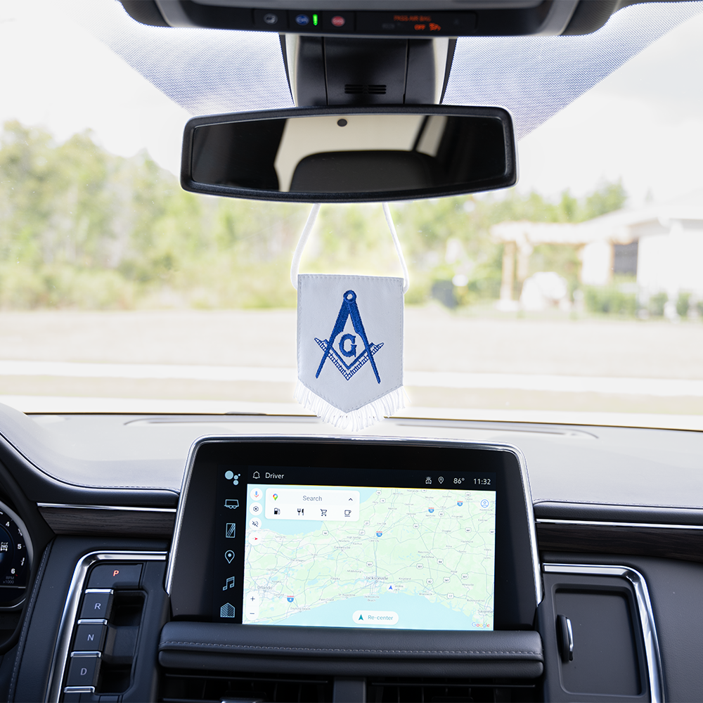 The flag features a blue machine-embroidered Square & Compass with G on both sides, ensuring visibility and recognition from any angle. A white elastic loop allows for easy hanging on your car’s rearview mirror, while the white fringe at the bottom adds a dignified finishing touch.