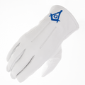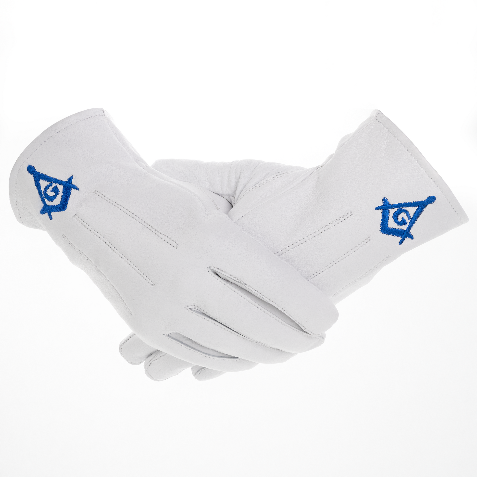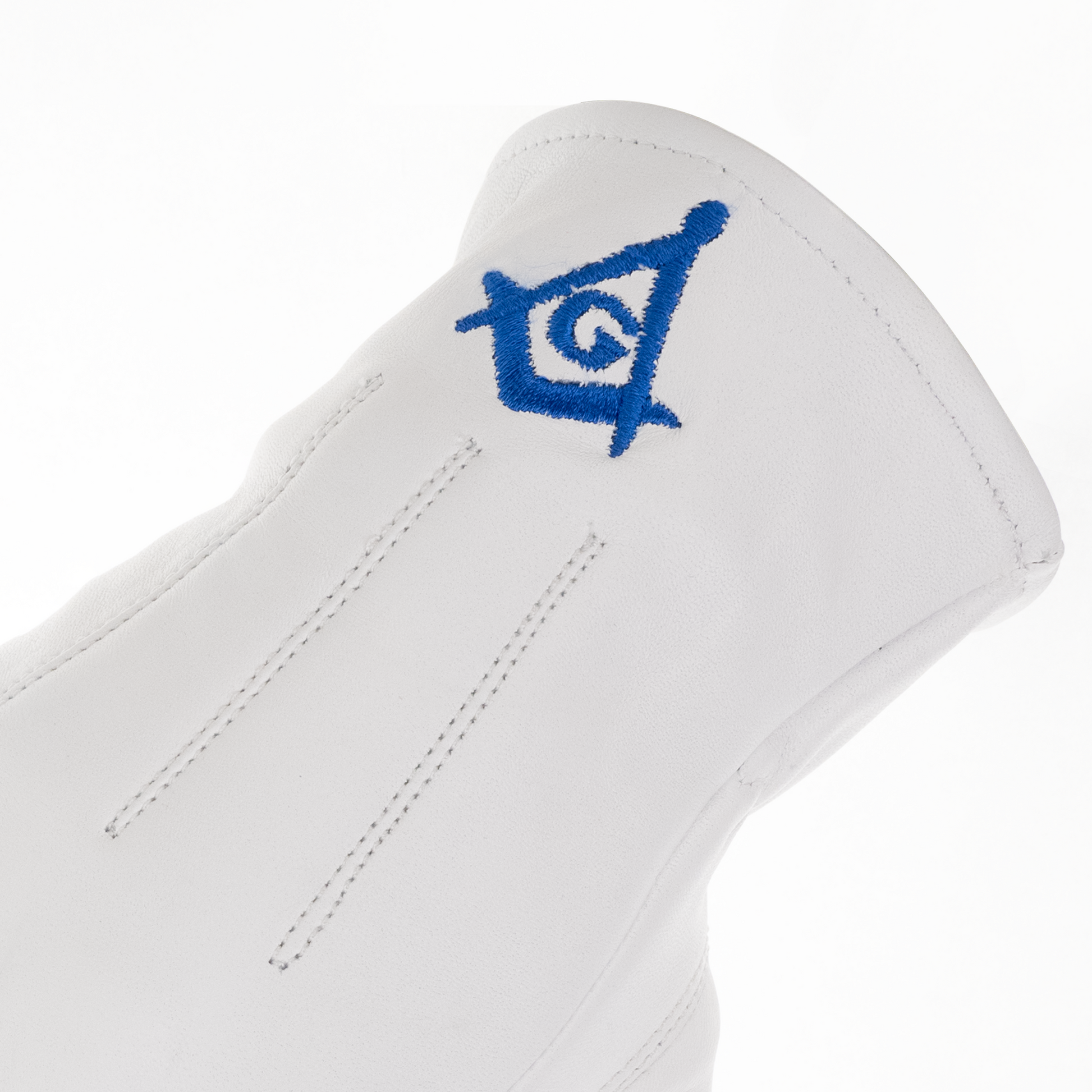 Lined White Lambskin Leather Gloves with Blue Square & Compass Embroidery